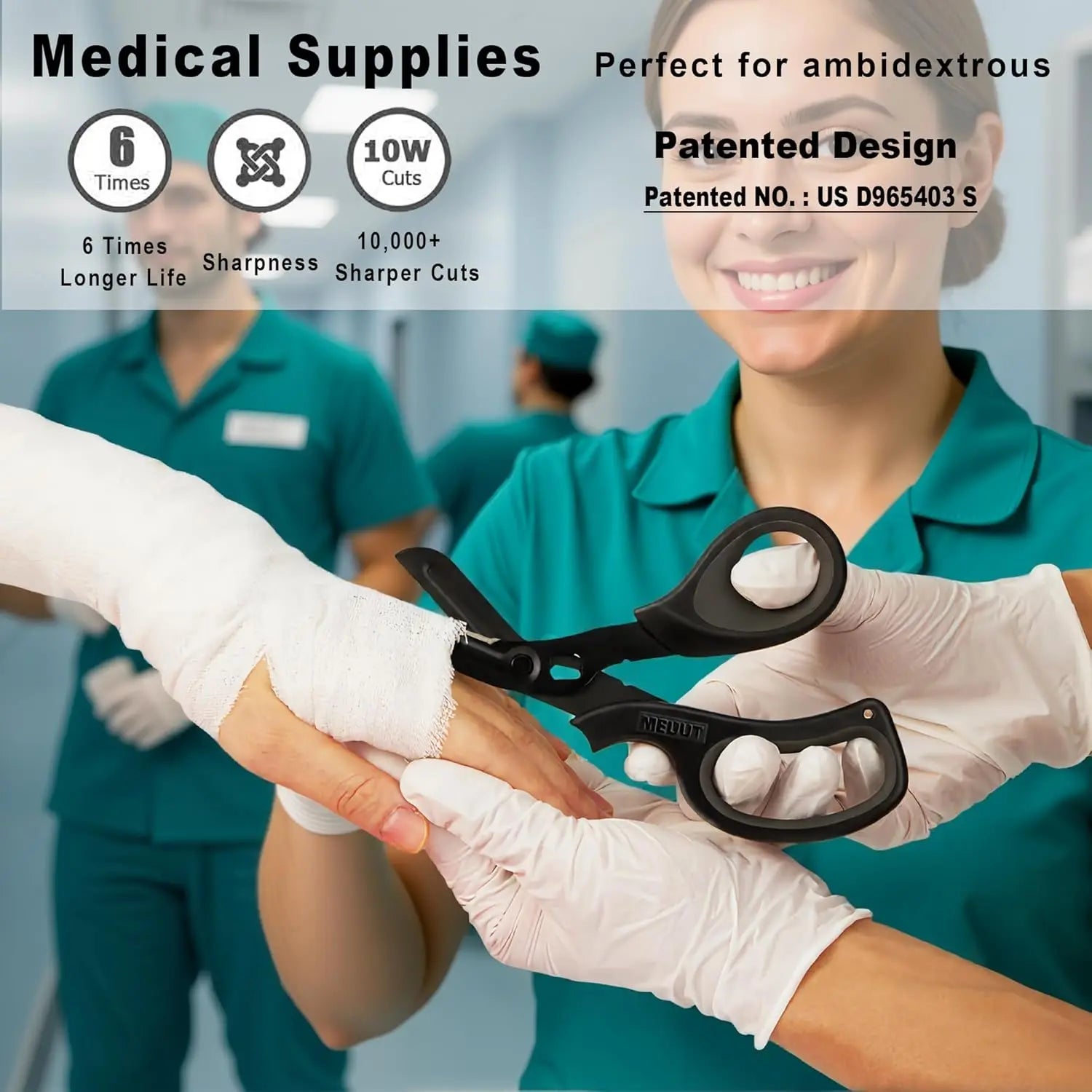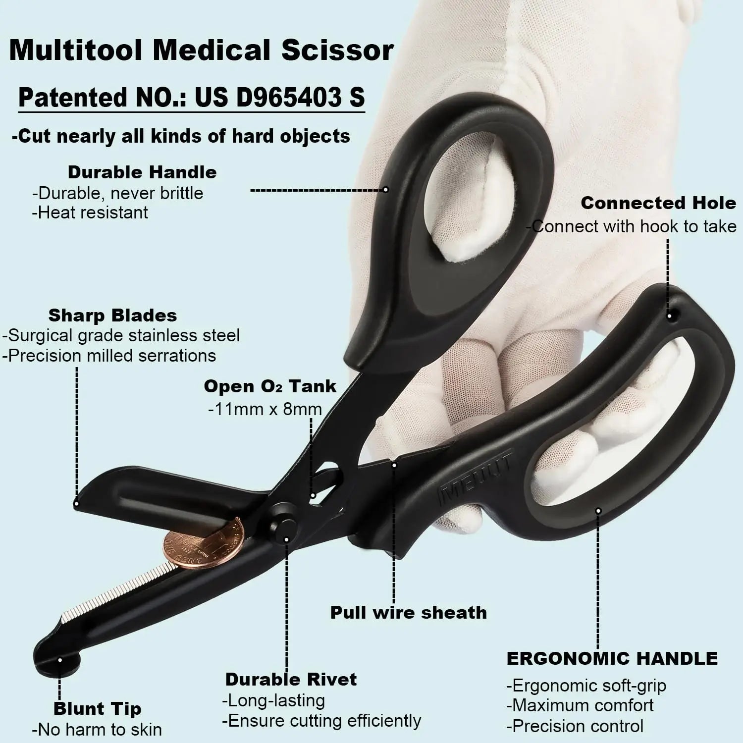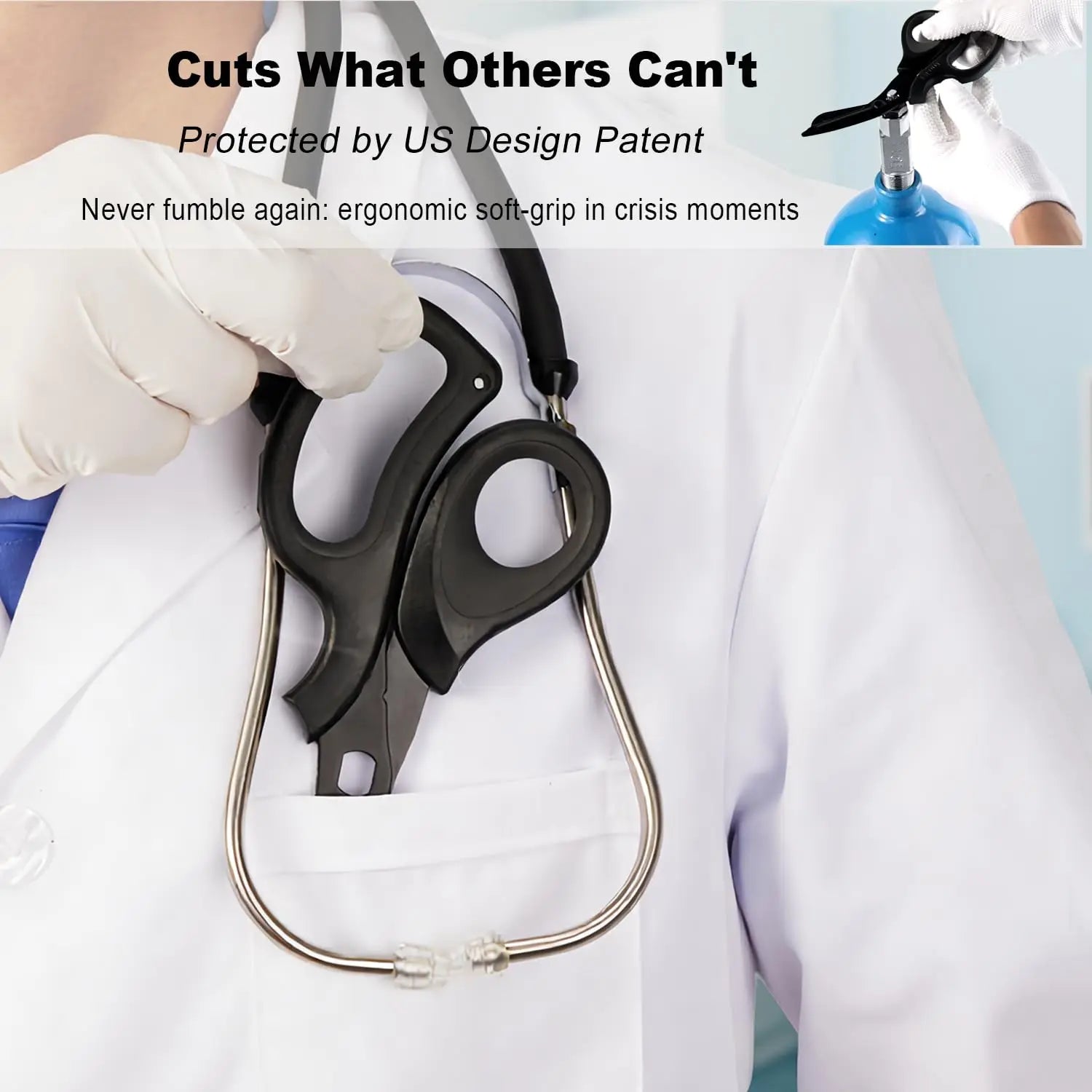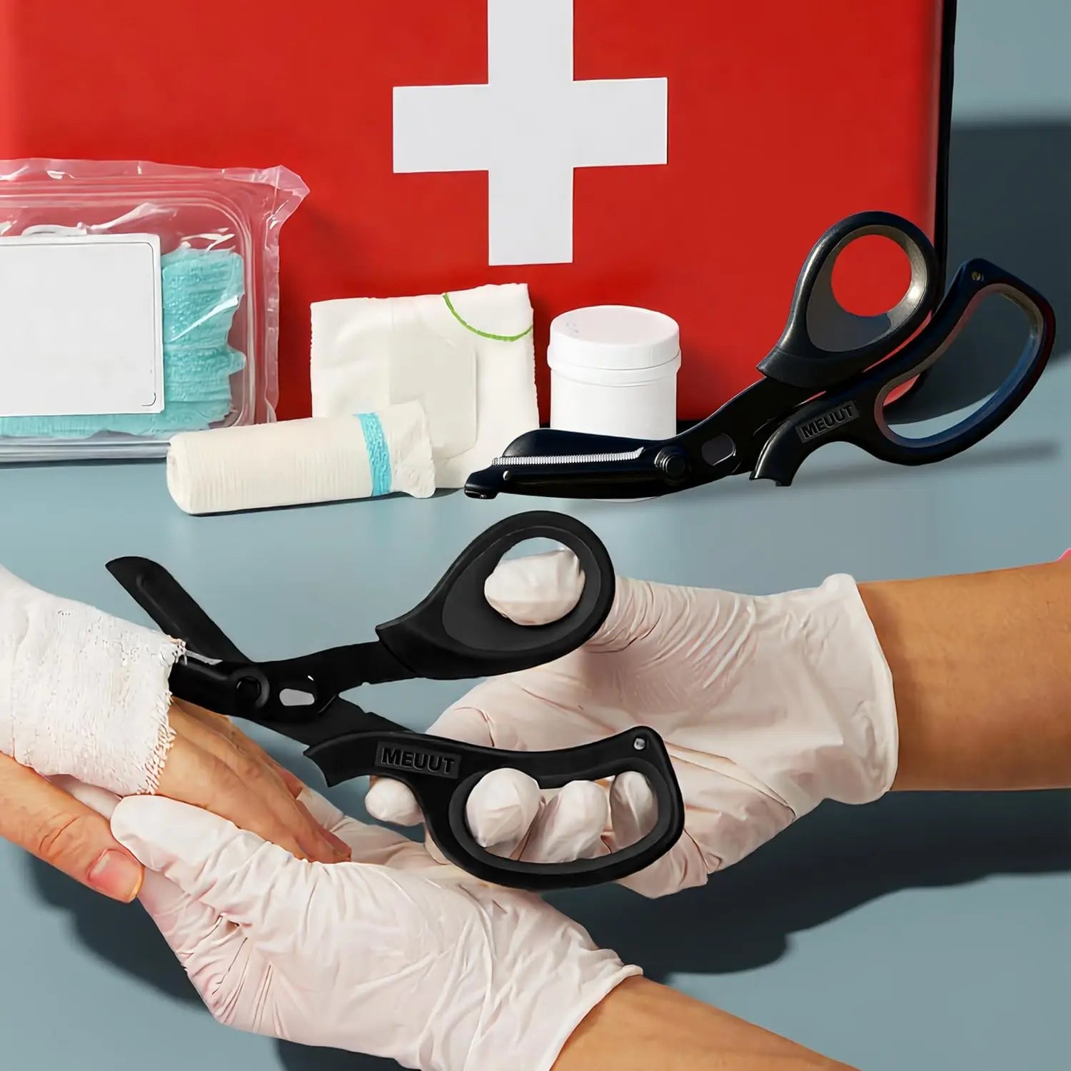 Heavy-duty medical scissors for fast cutting in emergencies Material: Stainless steel bladesFunction: Cuts clothing, bandages, rope, and seat beltsDesign: Ergonomic non-slip handleUse: First aid kits, emergency and survival situations